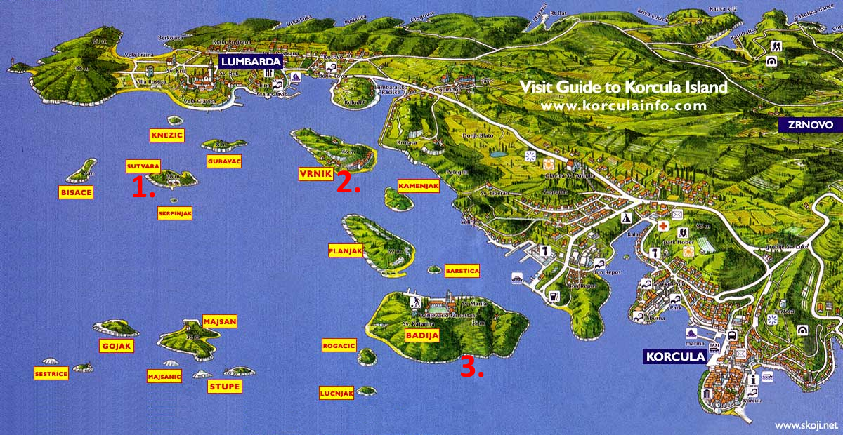 Vrnik (2nd): ist die Insel, auf der sich der älteste Steinbruch Korčulas befindet (aus der Jungsteinzeit; es gibt auch Aufzeichnungen darüber, dass Diokletian Gefangene auf diese Insel schickte, um ihre Todesurteile umzuwandeln). Ab dem 14. Jahrhundert wurde der auf der Insel Vrnik behauene Stein nach Dubrovnik und später nach Šibenik und Zadar exportiert. Einige Paläste in Dubrovnik sowie in Venedig, Wien und sogar Washington wurden aus Vrnik-Stein erbaut.